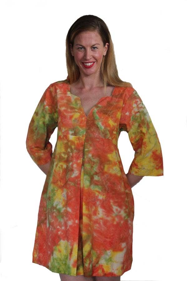 In comfortable cotton, this hand tie-dyed kaftan is long enough to be worn as a dress or as a top over culottes or leggings. This fashion tunic suits all cultures and copes well with spring-summer or transitional seasons. It is flexible as a beach cover-up or a day dress.