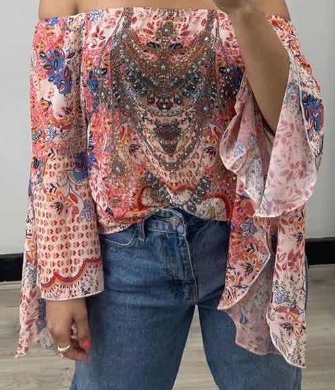Put the glam into your summer with this Camilla-inspired Pink Patterned Off Shoulder Floaty Top. For evening or daytime elegance throughout the warmer months.