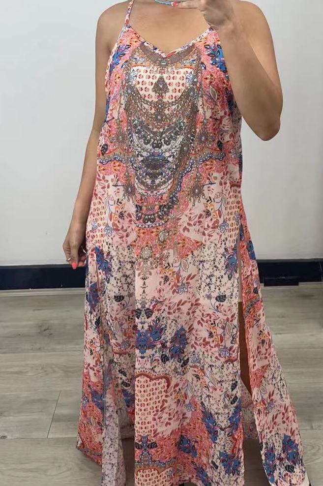 Put the glam into your summer with this pink Camilla-inspired Vibrant Maxi Dress with Sequin detail. The gorgeous floral Maxi features side splits, gathered detail at the back and adjustable shoestring straps.