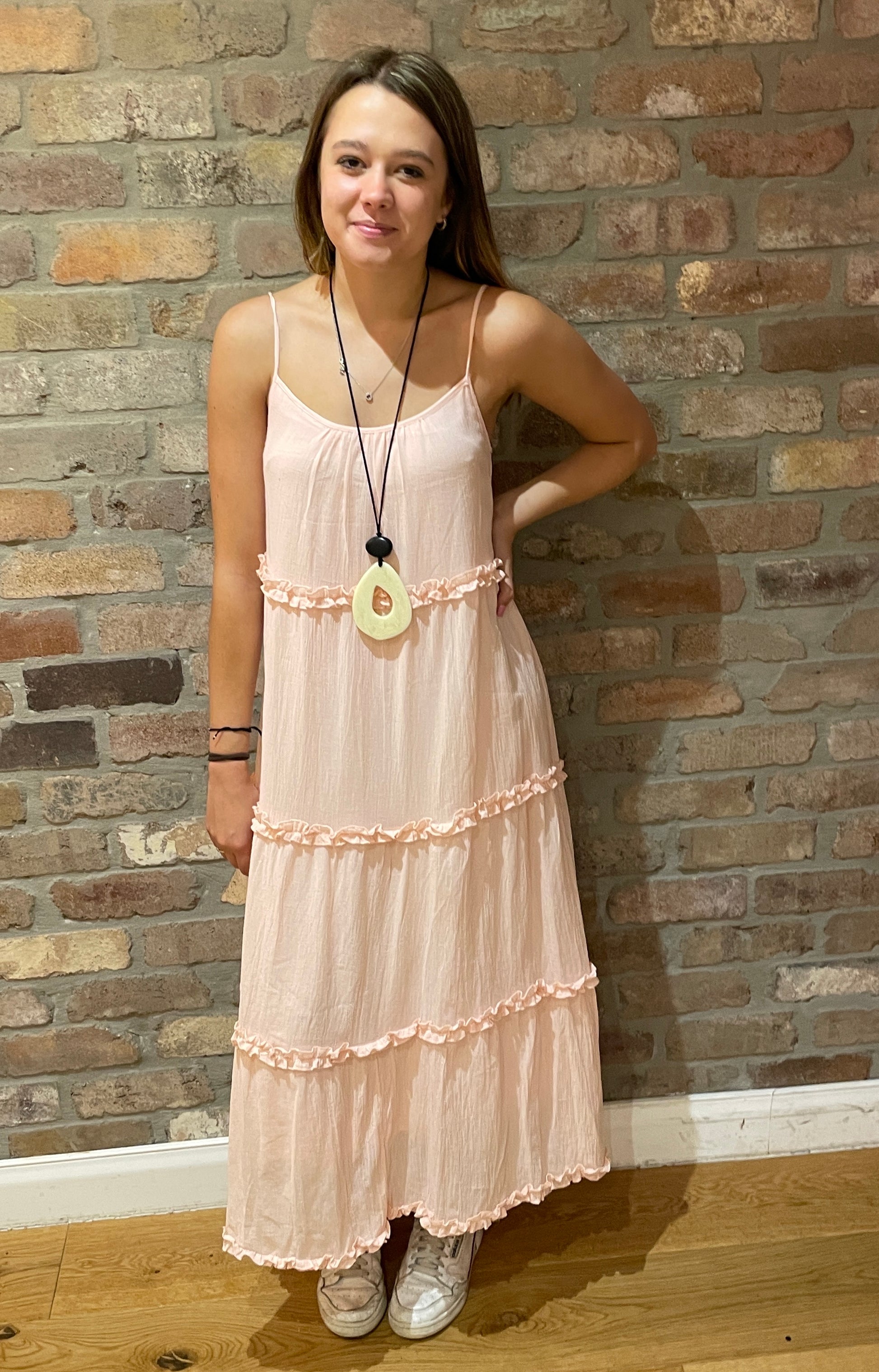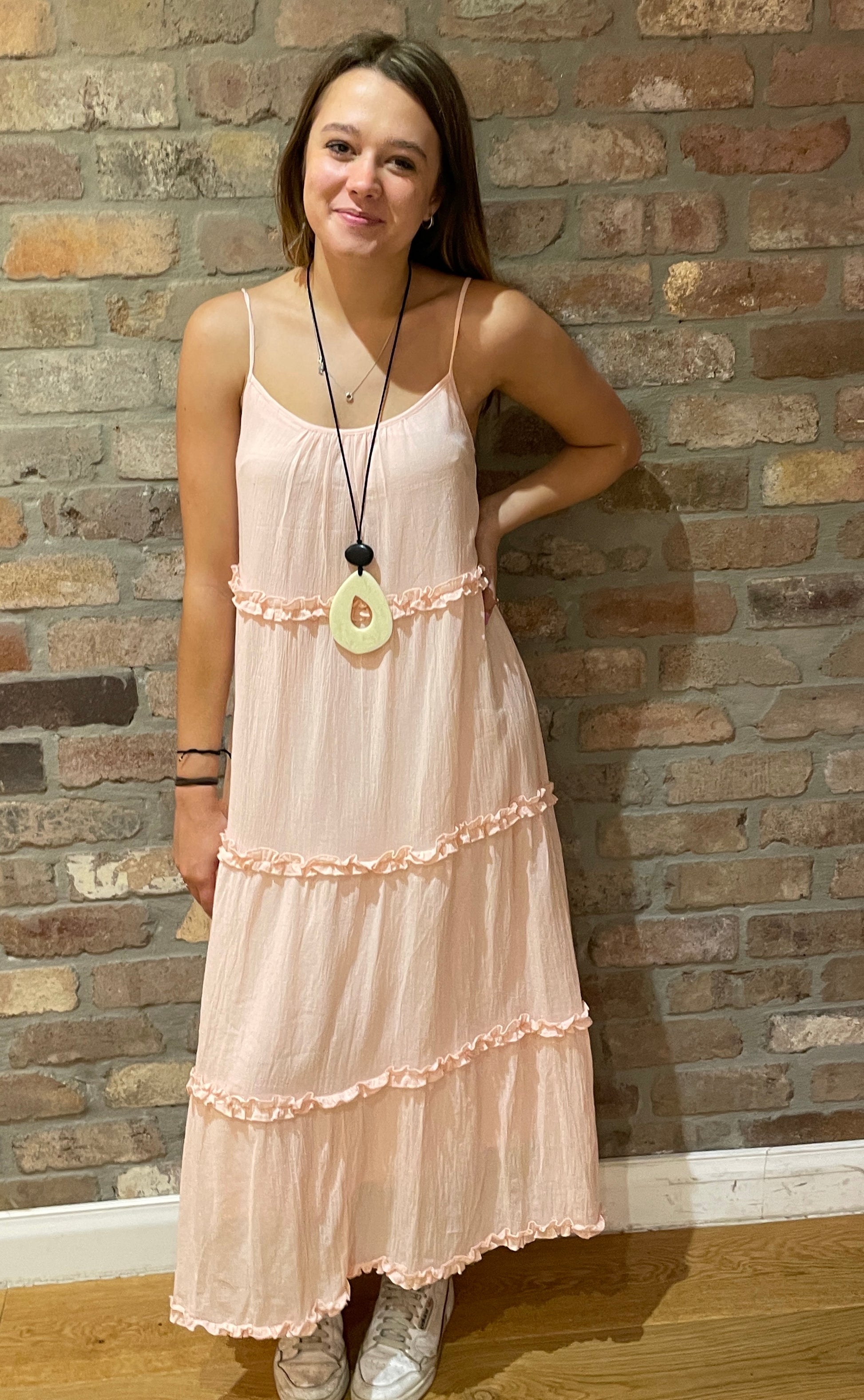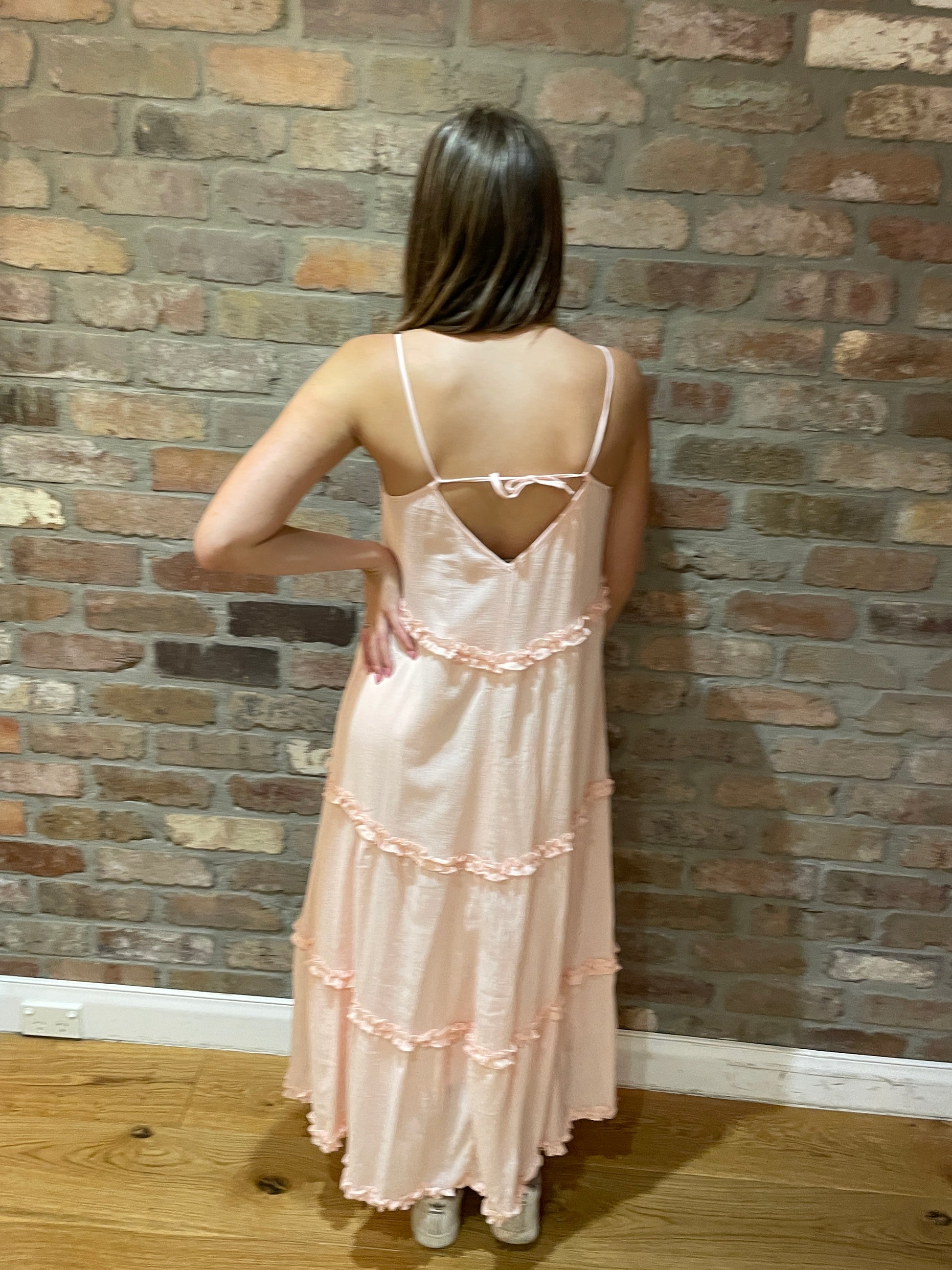 The maxi has adjustable straps that tie at the back. Skirt is frilled.