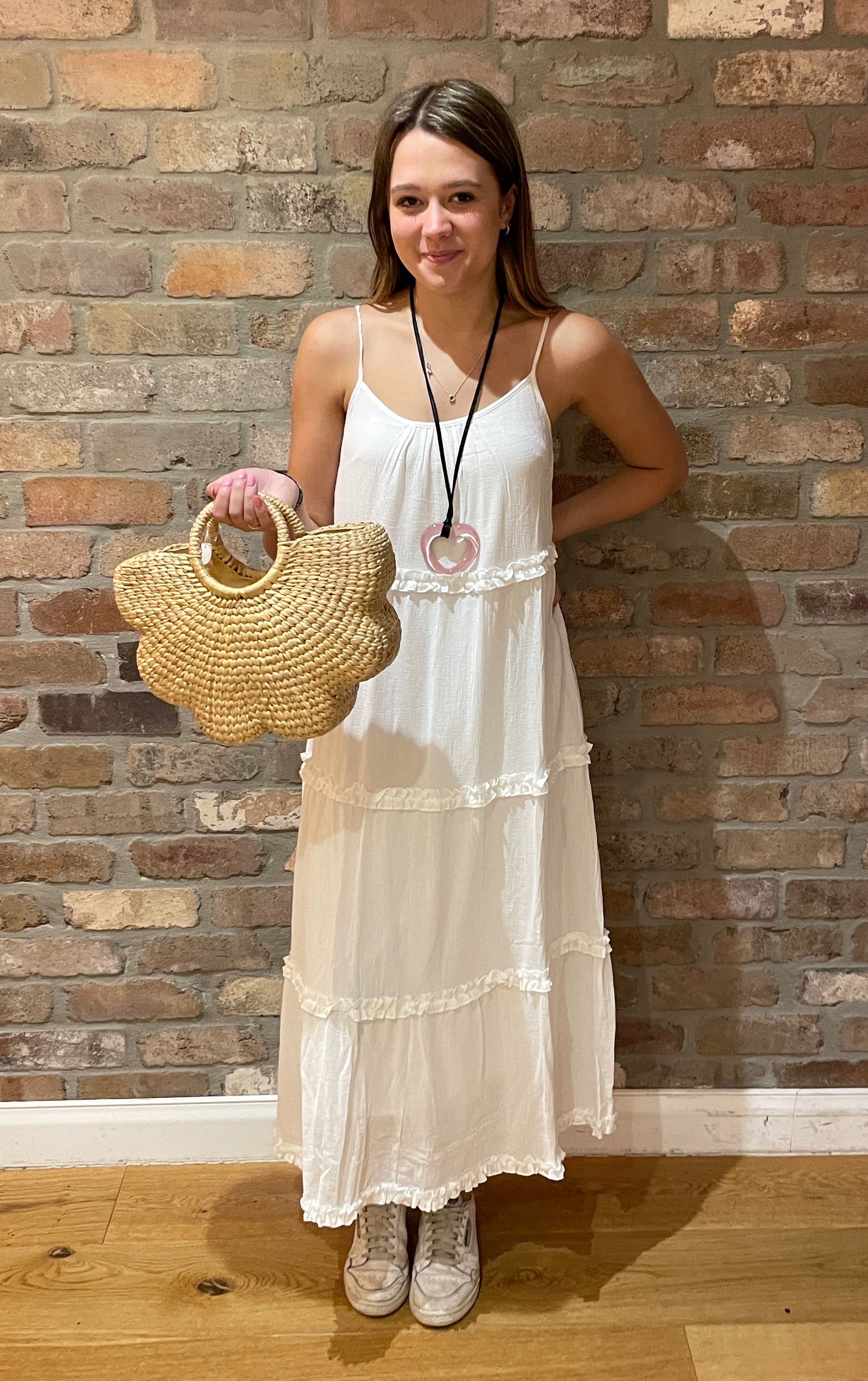 The maxi has adjustable straps that tie at the back. Skirt is frilled.